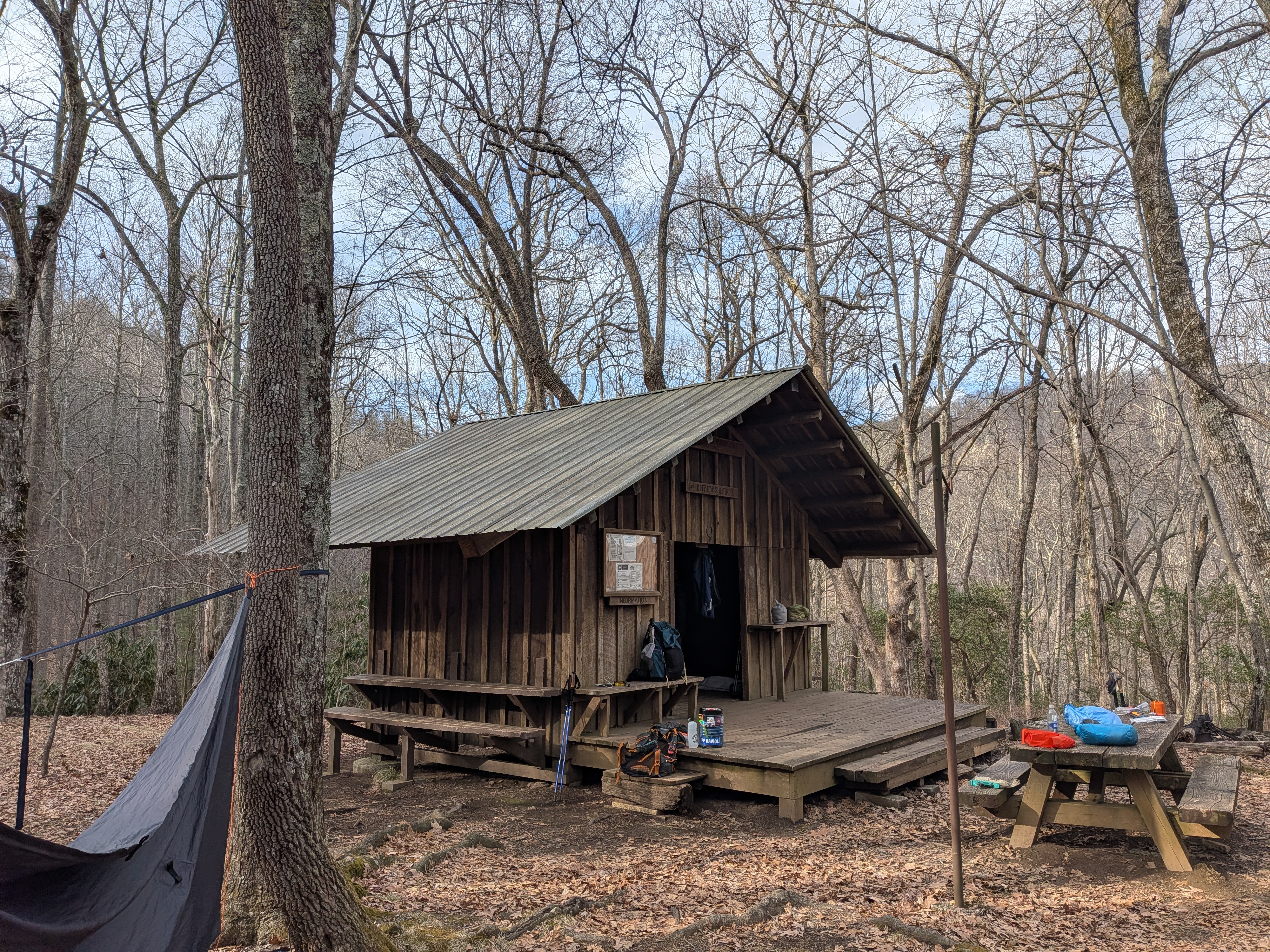 Made it to the deep gap shelter. Easy enough stroll down. I think I’ve got a real solid hammock hang too. Got here at 4ish and everyone here is struggling to stay awake. Shelter is super nice actually, two stories, and has windows. Met two new folks that showed up, Tai, and Lonestar (first person I’ve met from Texas). Everyone is bailing into a hostel or town tomorrow as a gnarly cold front is coming in (us included). The next actual campsite we will be reaching us expected to get down to 13 degrees tomorrow. Tomorrow will be easy physically, but will be a lot of watching weather and planning. The odds of being out of Georgia this coming week are very high.