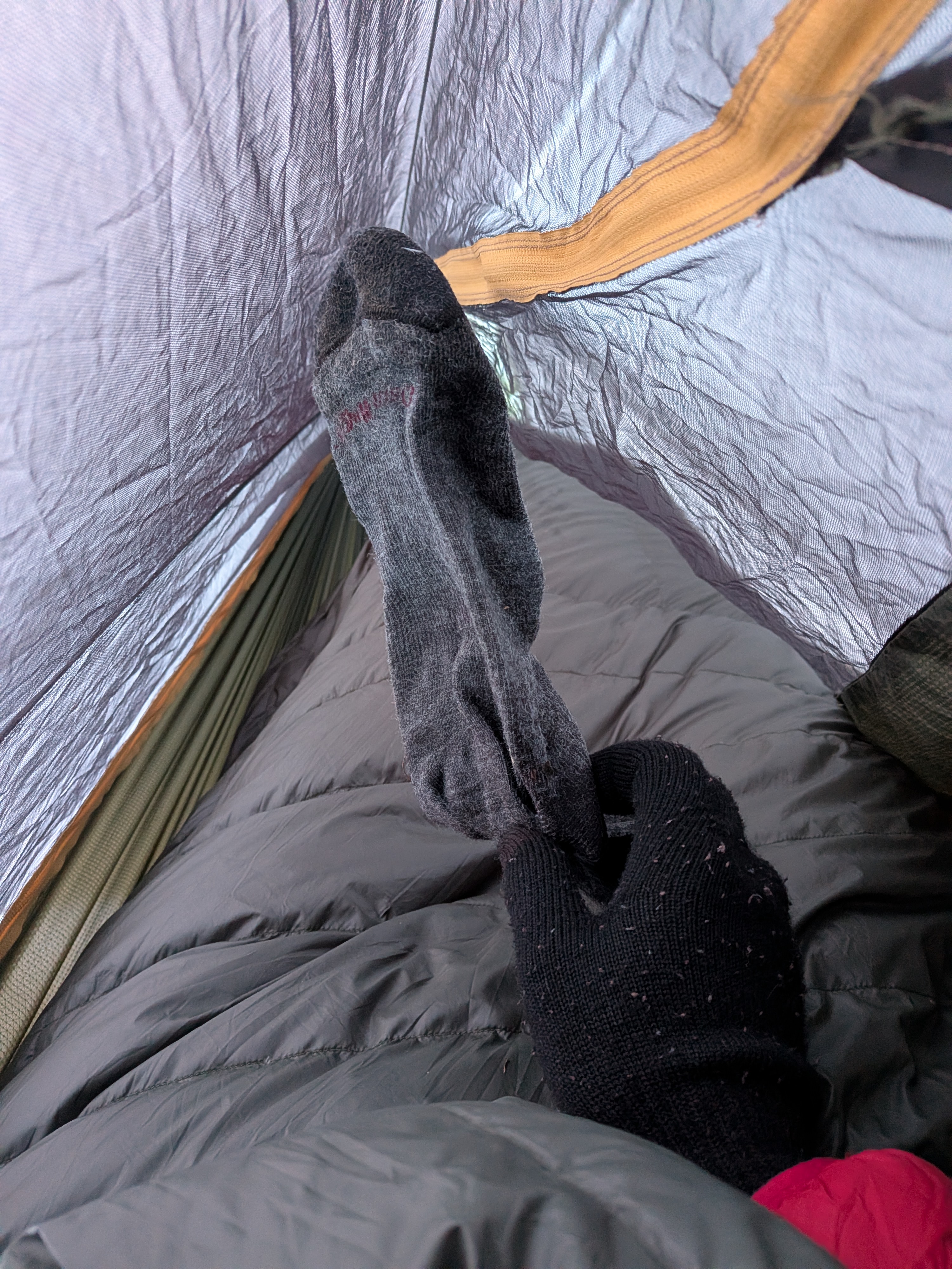 Woke up this morning and my shoes and socks were frozen solid. Thought that maybe if I slept in a bit they’d thaw. Did not help. I roll with a spare pair of socks tho, so manageable.